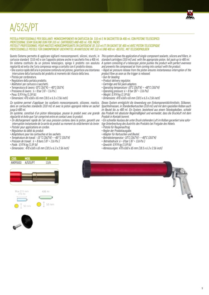 PISTOLA PROFESSIONALE PER SIGILLANTI MONOCOMPONENTI IN CARTUCCIA DA 310 ml E IN SACCHETTO DA 400 ml. CON PISTONE TELESCOPICO