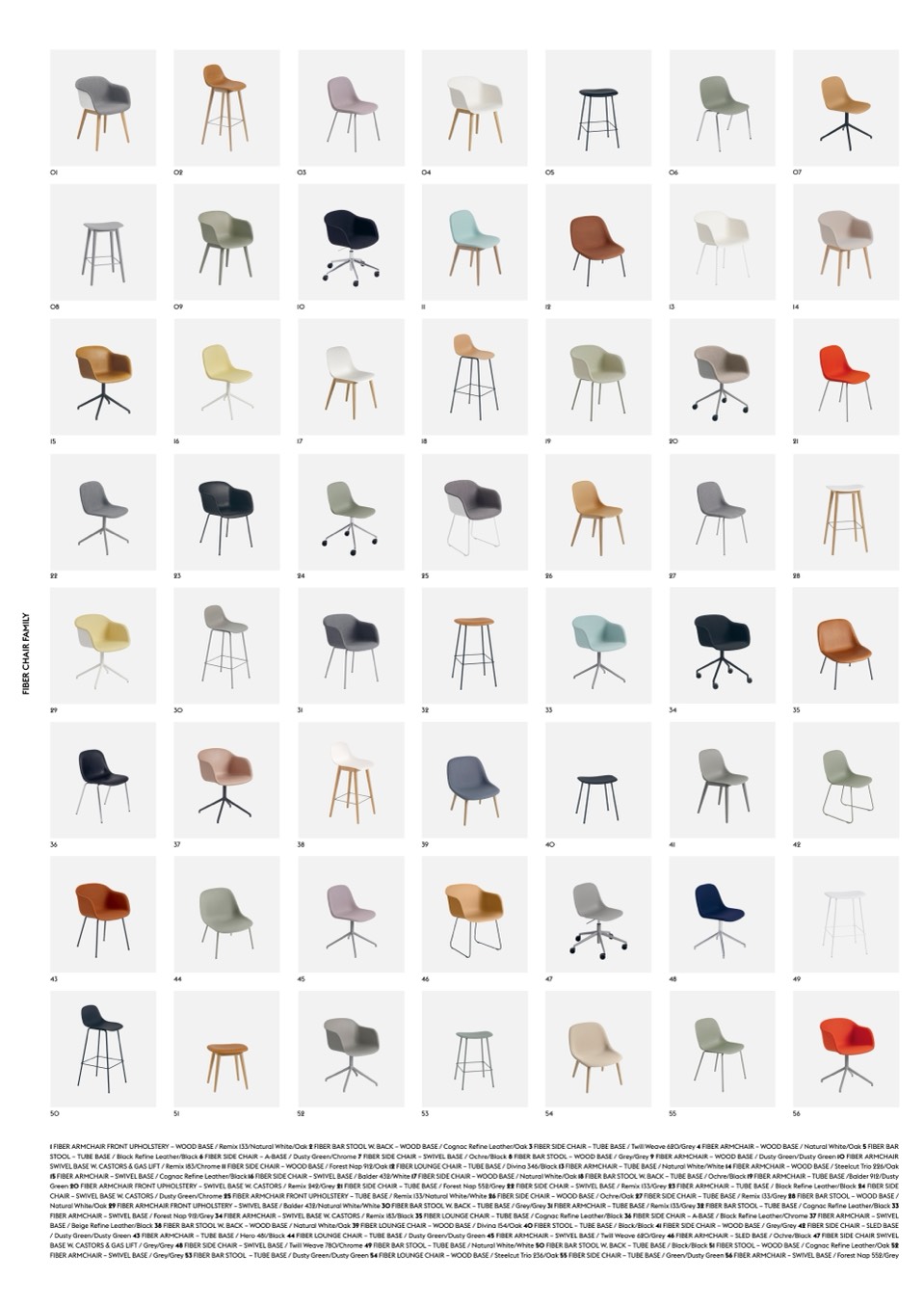 FIBER ARMCHAIR – SWIVEL BASE / Grey/Grey 53 FIBER BAR STOOL – TUBE BASE / Dusty Green/Dusty Green 54 FIBER LOUNGE CHAIR – WOOD BASE / Steelcut Trio 236/Oak 55 FIBER SIDE CHAIR – TUBE BASE / Green/Dusty Green 56 FIBER ARMCHAIR – SWIVEL BASE / Forest Nap 552/Grey