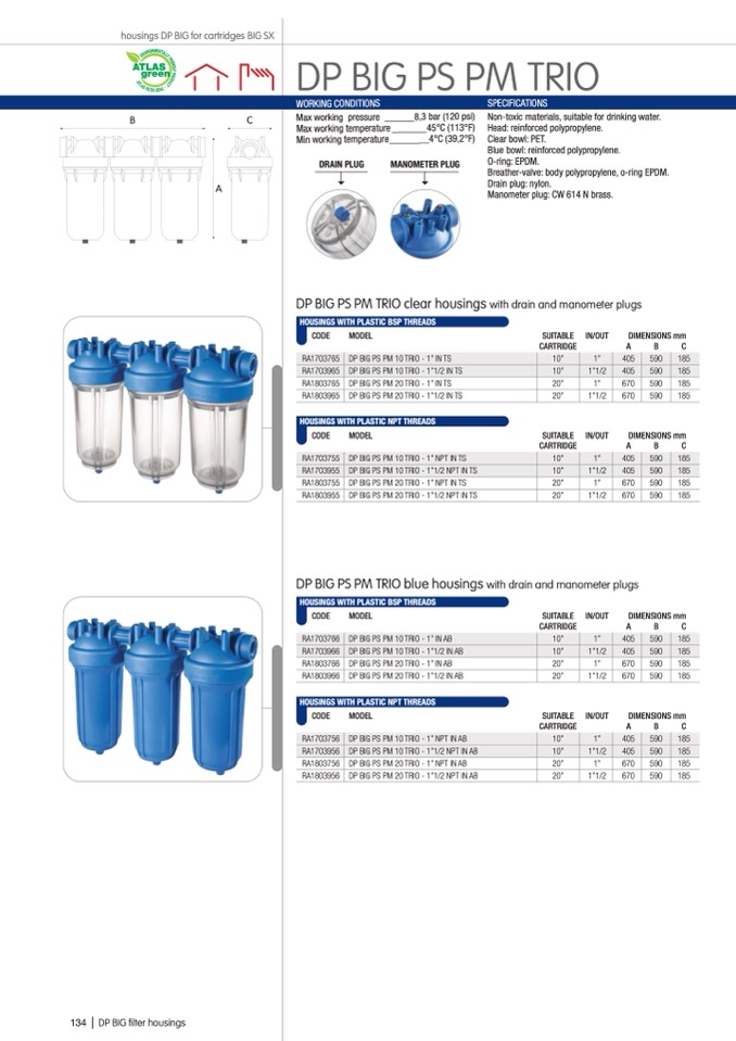 DP BIG PS PM TRIO blue housings with drain and manometer plugs