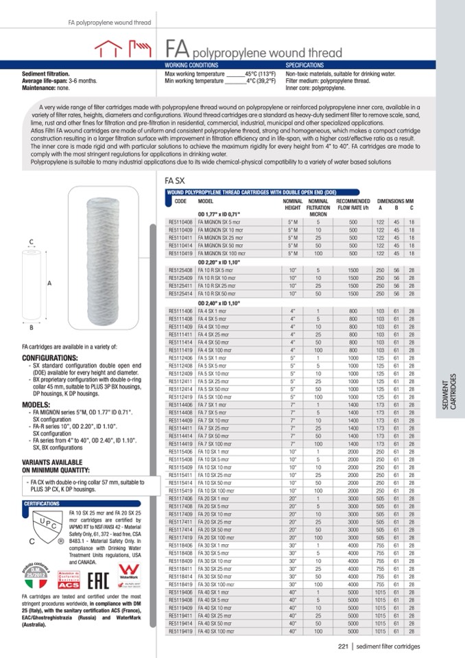 Atlas Filtri FA wound cartridges are made of uniform and consistent polypropylene thread, strong and homogeneous, which makes a compact cartridge