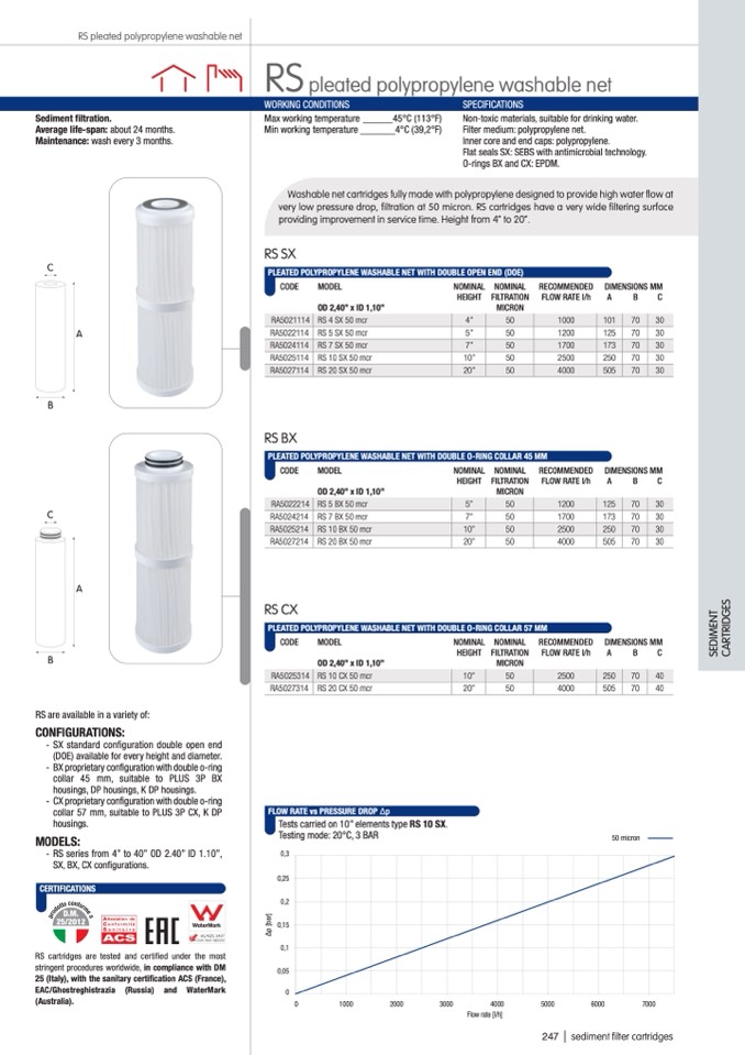 very low pressure drop, filtration at 50 micron. RS cartridges have a very wide filtering surface