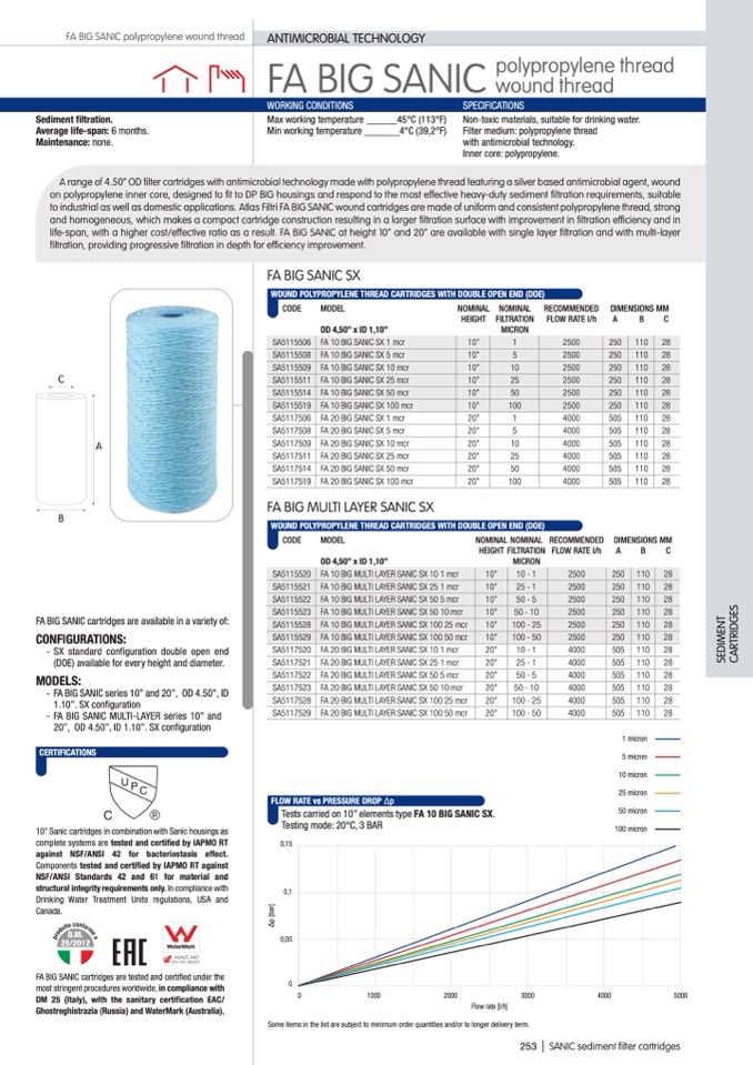 to industrial as well as domestic applications. Atlas Filtri FA BIG SANIC wound cartridges are made of uniform and consistent polypropylene thread, strong