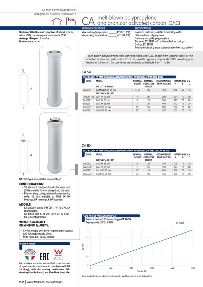 filtration at 25 micron. CA cartridges are available with height from 4” to 20”.