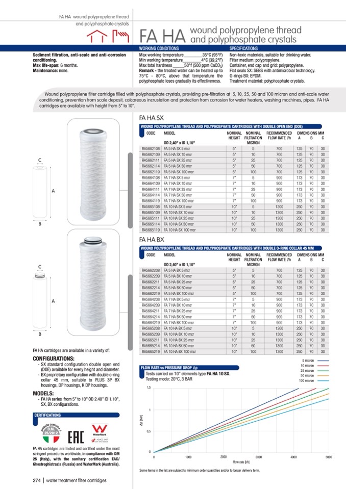 Wound polypropylene filter cartridge filled with polyphosphate crystals, providing pre-filtration at 5, 10, 25, 50 and 100 micron and anti-scale water