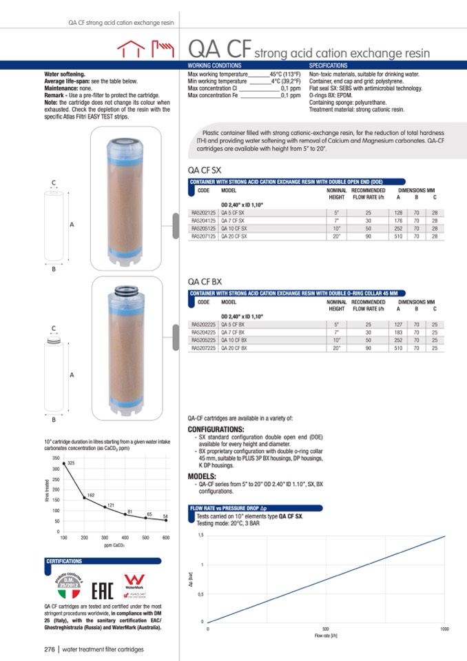 (TH) and providing water softening with removal of Calcium and Magnesium carbonates. QA-CF