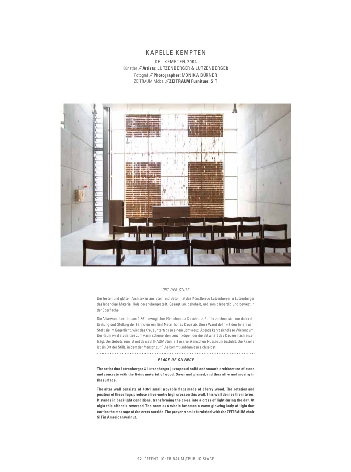 trägt. Der Gebetsraum ist mit dem ZEITRAUM Stuhl SIT in amerikanischem Nussbaum bestuhlt. Die Kapelle