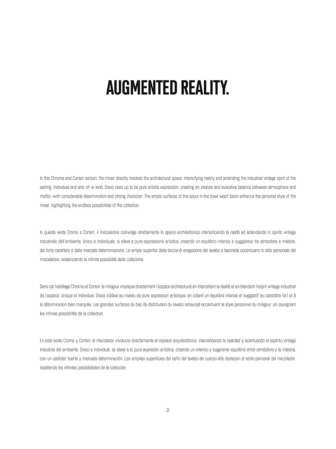 Dans cet habillage Chrome et Corten, le mitigeur implique directement l’espace architectural en intensifiant la réalité et en étendant l’esprit vintage industriel