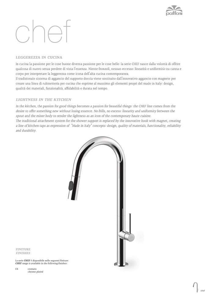 a line of kitchen taps as expression of “Made in Italy” concepts: design, quality of materials, functionality, reliability