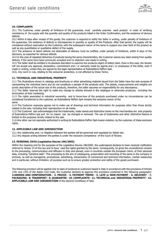 PACKAGING - 8. TRANSPORT - 9. GUARANTEE - 10. COMPLAINTS - 11. TECHNICAL and INDUSTRIAL PROPERTY - 12.
