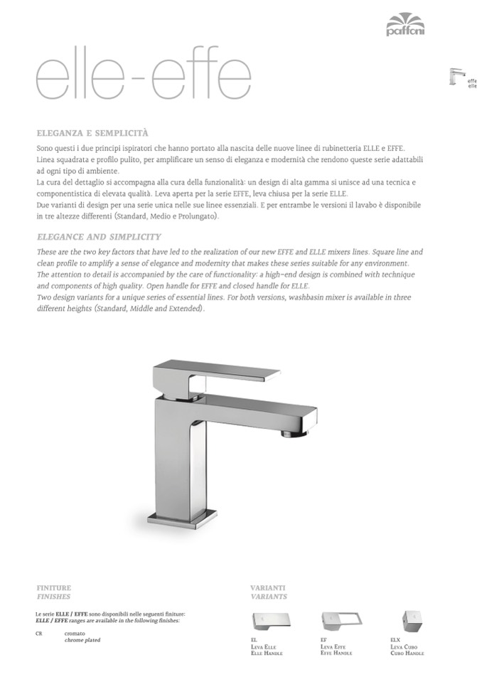 componentistica di elevata qualità. Leva aperta per la serie EFFE, leva chiusa per la serie ELLE.