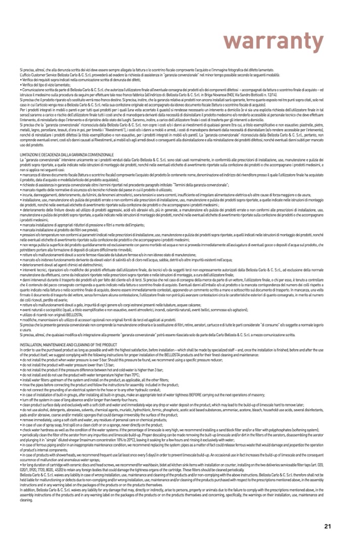 Bellosta Carlo & C. S.r.l. waives any liability in case of wrong installation, use, maintenance and cleaning of the products and/or non-complying with the above instructions. Bellosta Carlo & C. S.r.l. therefore shall not be