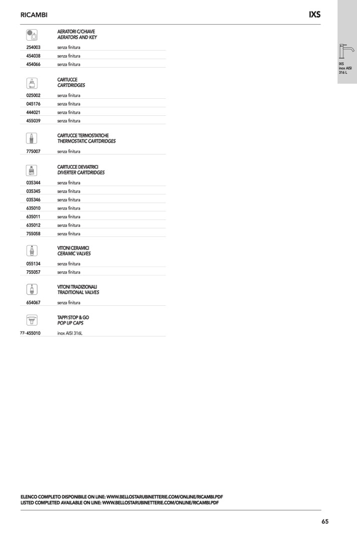 ELENCO COMPLETO DISPONIBILE ON LINE: WWW.BELLOSTARUBINETTERIE.COM/ONLINE/RICAMBI.PDF