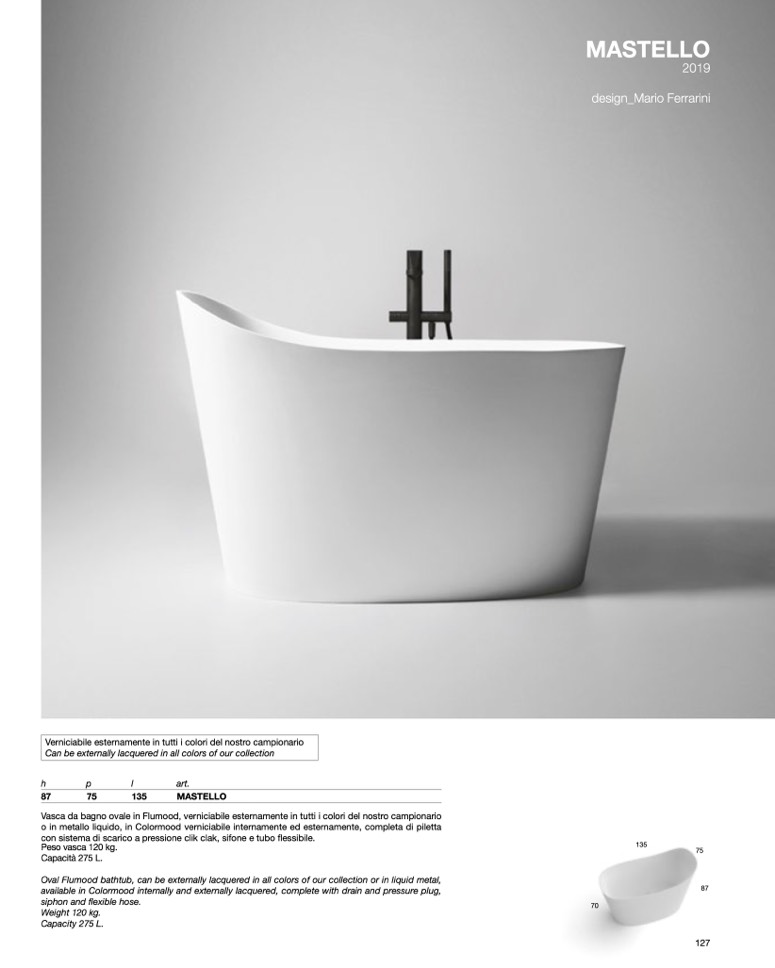 o in metallo liquido, in Colormood verniciabile internamente ed esternamente, completa di piletta