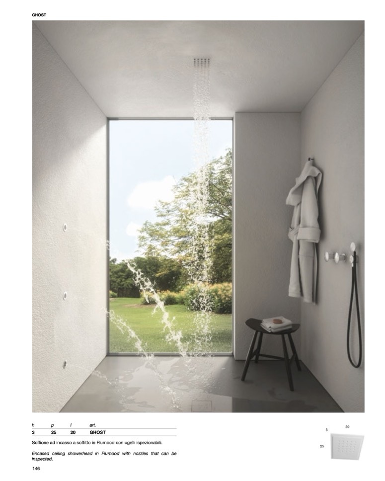 Soffione ad incasso a soffitto in Flumood con ugelli ispezionabili.