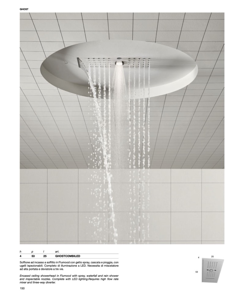 Encased ceiling showerhead in Flumood with spray, waterfall and rain shower