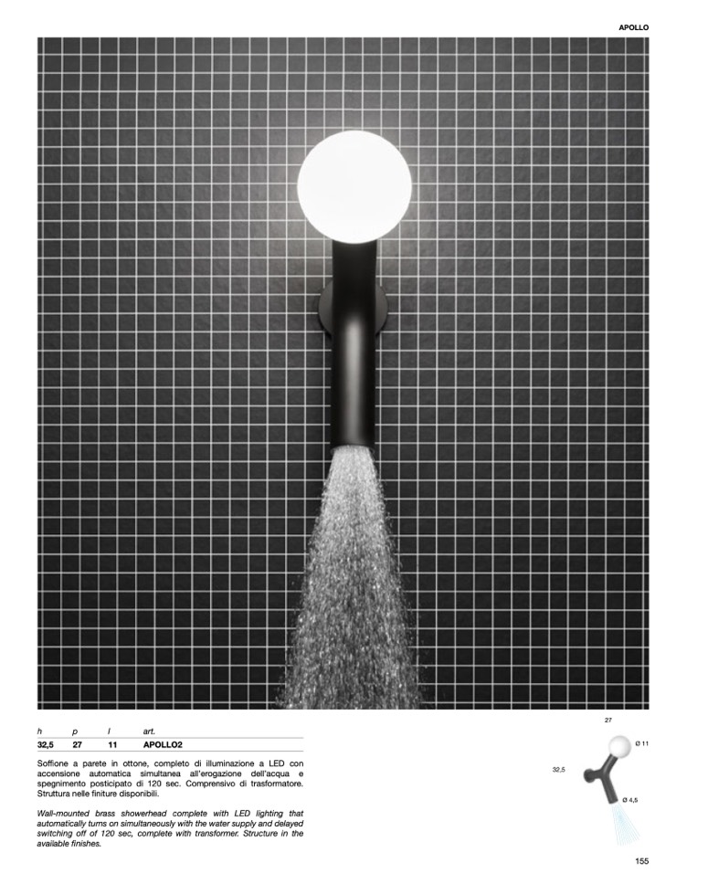 Soffione a parete in ottone, completo di illuminazione a LED con