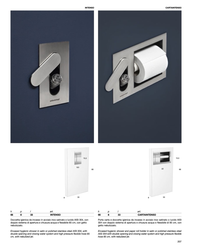 Porta carta e doccetta igienica da incasso in acciaio inox satinato o lucido AISI