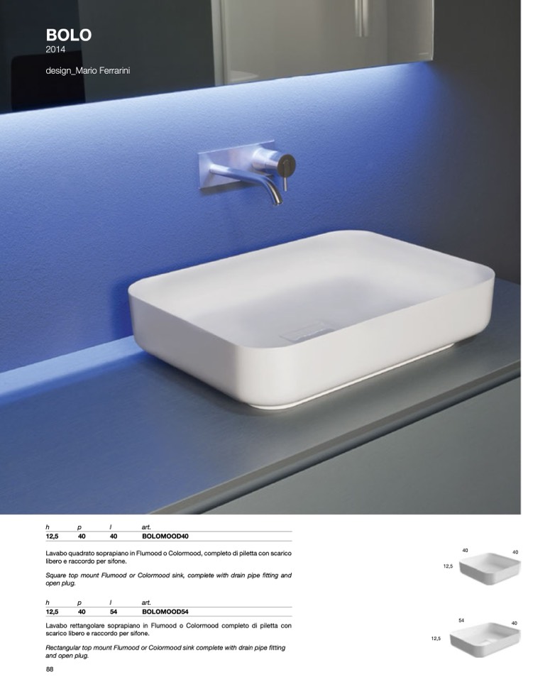 Lavabo quadrato soprapiano in Flumood o Colormood, completo di piletta con scarico