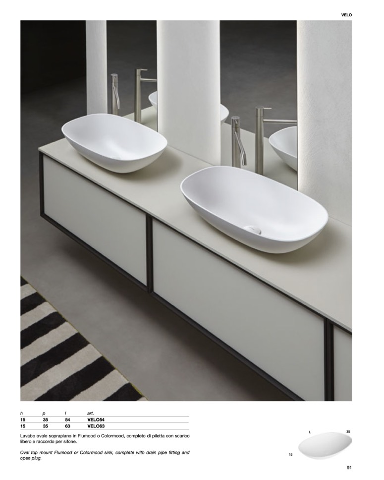 Lavabo ovale soprapiano in Flumood o Colormood, completo di piletta con scarico
