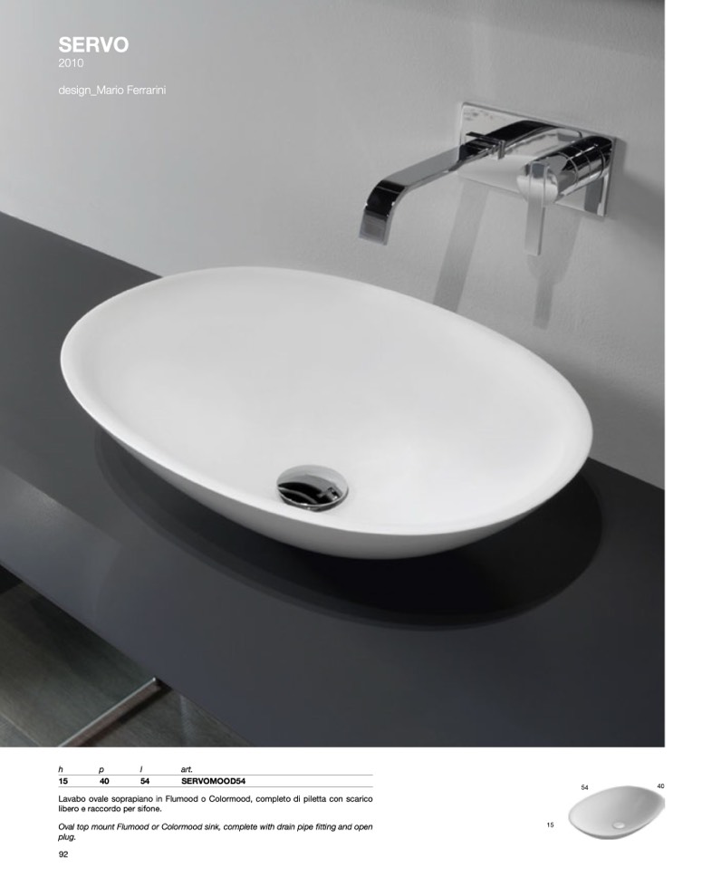 Lavabo ovale soprapiano in Flumood o Colormood, completo di piletta con scarico