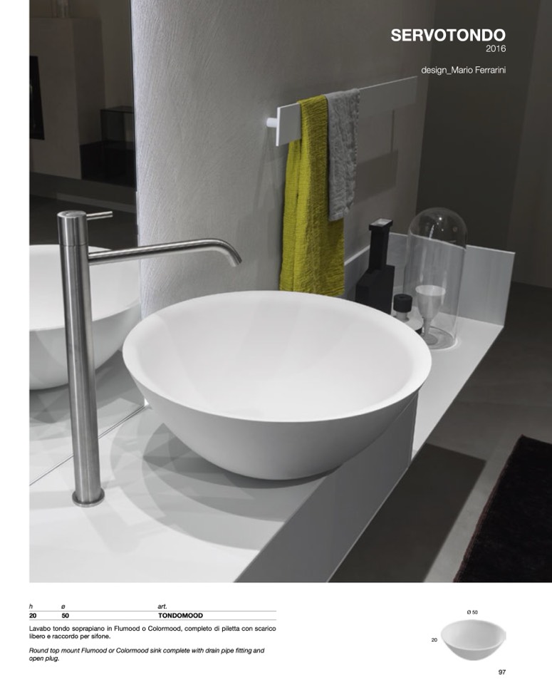 Lavabo tondo soprapiano in Flumood o Colormood, completo di piletta con scarico