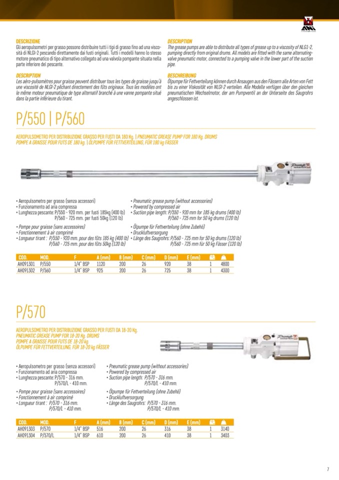 AEROPULSOMETRO PER DISTRIBUZIONE GRASSO PER FUSTI DA 180 Kg. | PNEUMATIC GREASE PUMP FOR 180 Kg. DRUMS