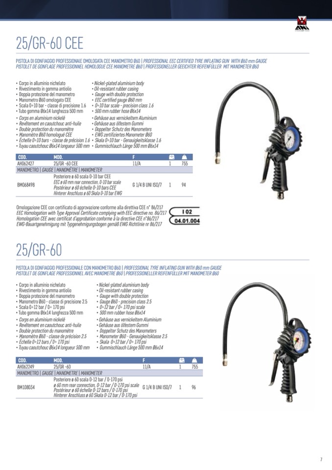 PISTOLA DI GONFIAGGIO PROFESSIONAlE OMOLOGATA CEE MANOMETRO Ø60 | PROFESSIONAL EEC CERTIFIED TYRE INFLATING GUN WITH Ø60 mm GAUGE