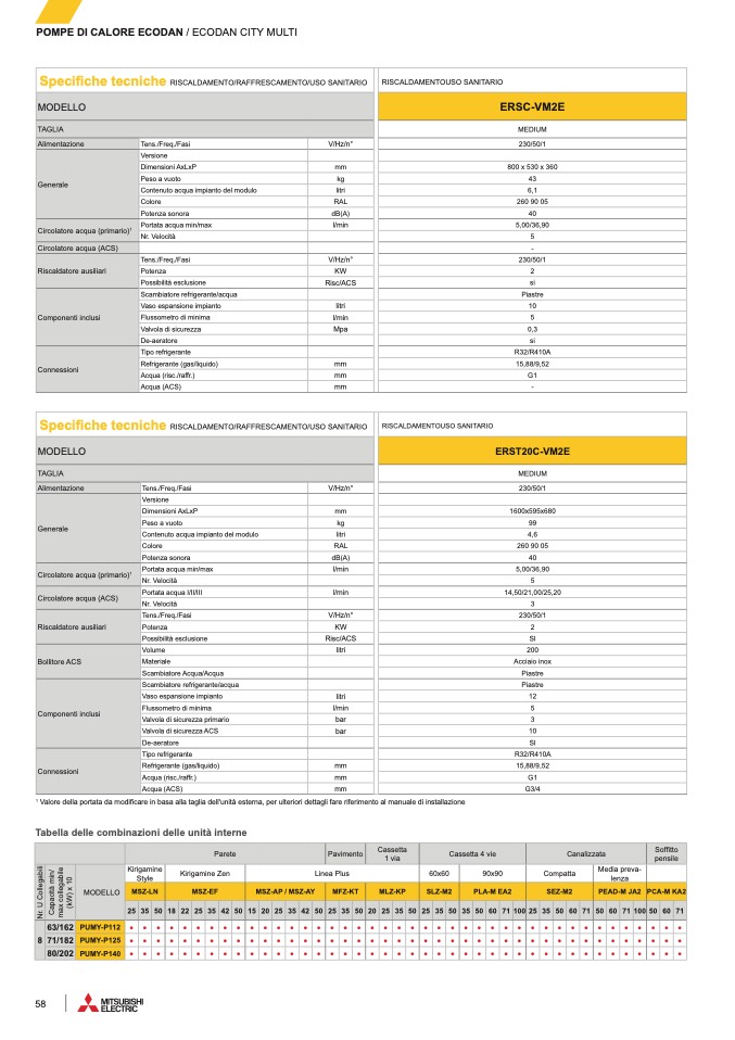 Tabella delle combinazioni delle unità interne