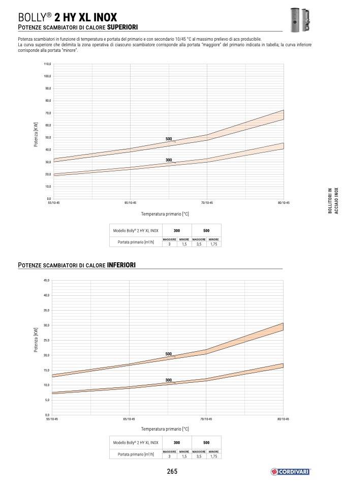 La curva superiore che delimita la zona operativa di ciascuno scambiatore corrisponde alla portata “maggiore” del primario indicata in tabella; la curva inferiore