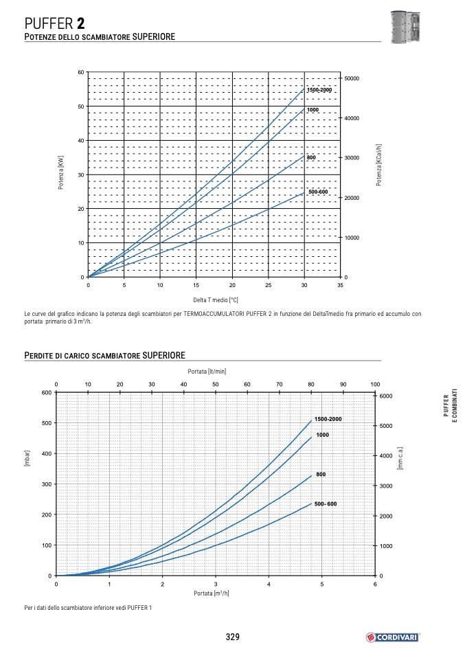 Le curve del grafico indicano la potenza degli scambiatori per TERMOACCUMULATORI PUFFER 2 in funzione del DeltaTmedio fra primario ed accumulo con