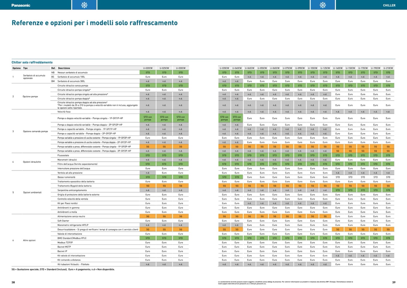 SQ = Quotazione speciale; STD = Standard (incluso); Euro = A pagamento; n.d = Non disponibile.