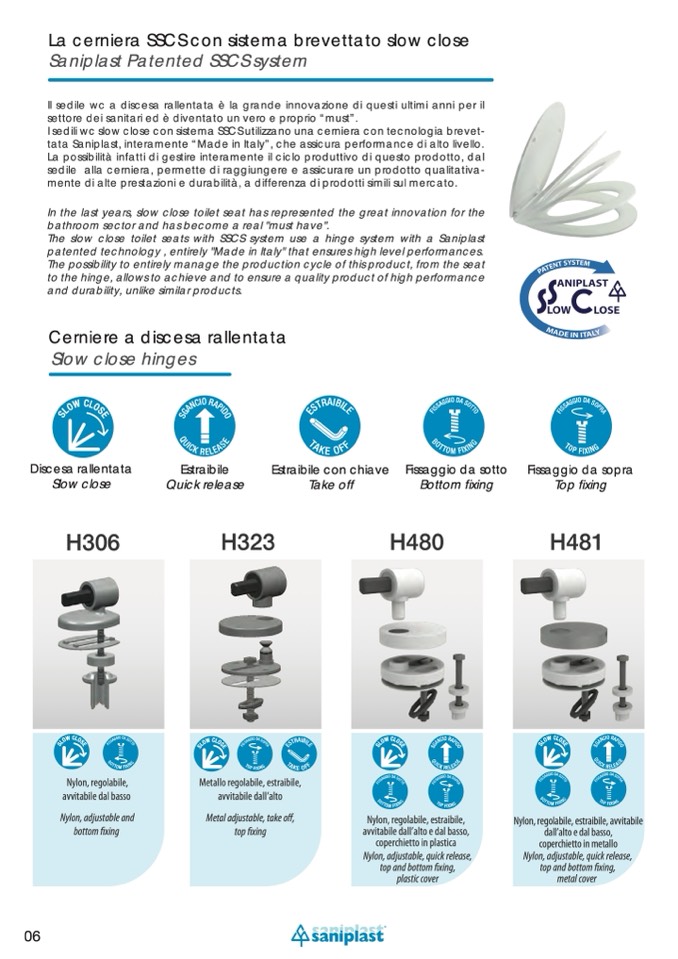 The slow close toilet seats with SSCS system use a hinge system with a Saniplast
