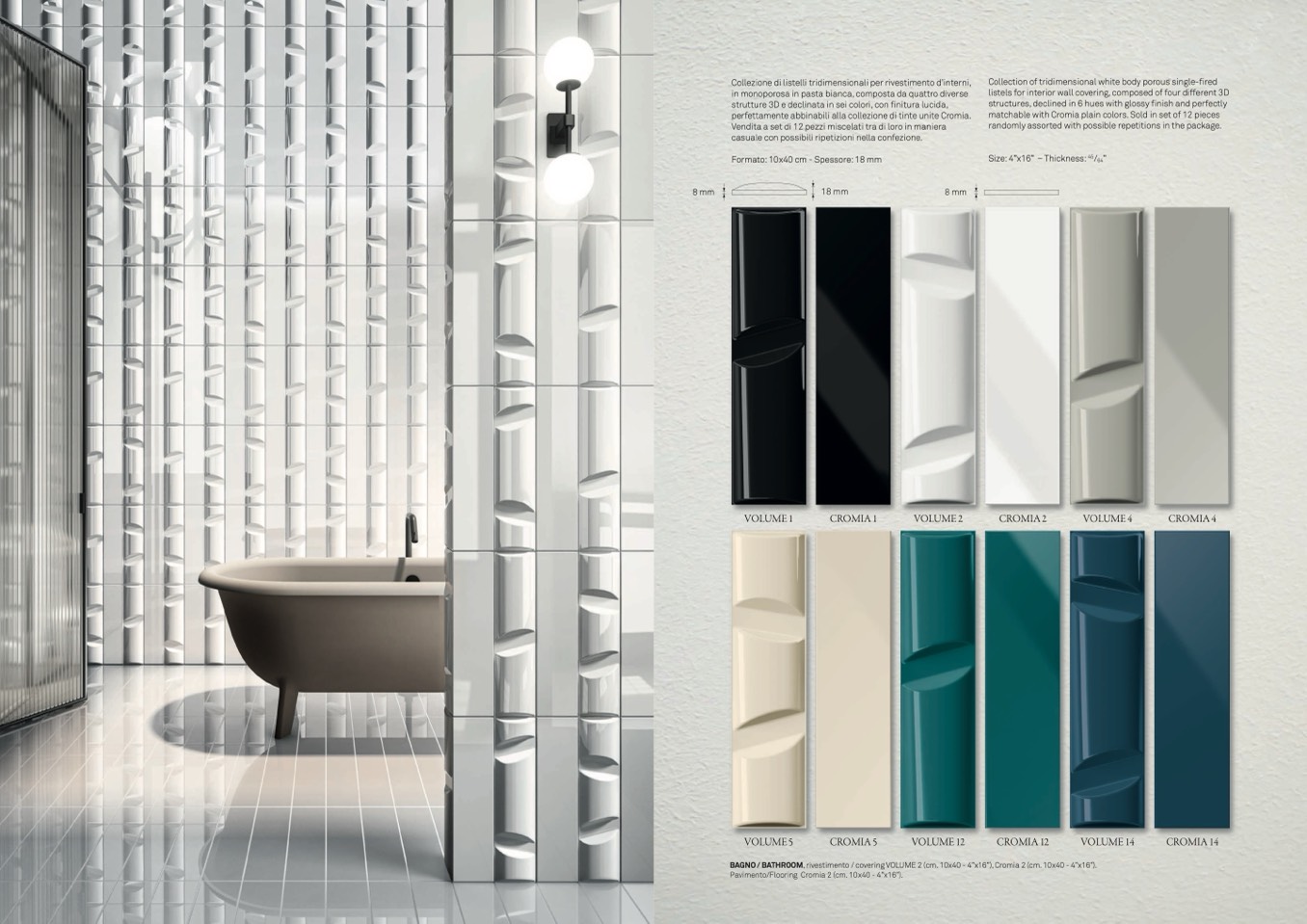 BAGNO / BATHROOM, rivestimento / covering VOLUME 2 (cm. 10x40 - 4”x16”), Cromia 2 (cm. 10x40 - 4”x16”).