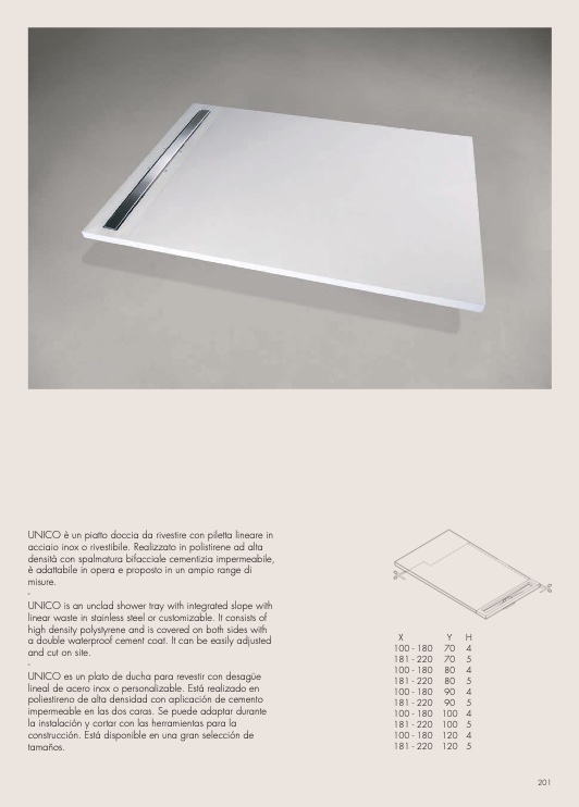 UNICO è un piatto doccia da rivestire con piletta lineare in