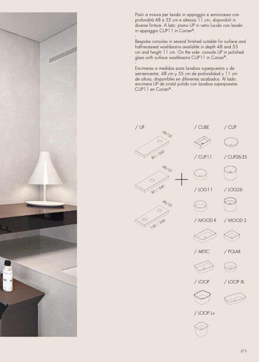 diverse finiture. A lato: piano UP in vetro lucido con lavabi