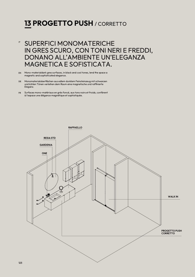 Mono-materialdark gres surfaces, in black and cool tones, lend the space a