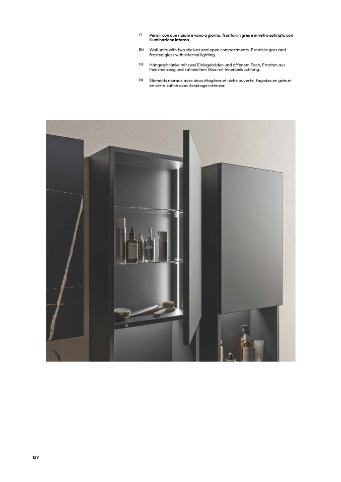 Wall units with two shelves and open compartments. Fronts in gres an