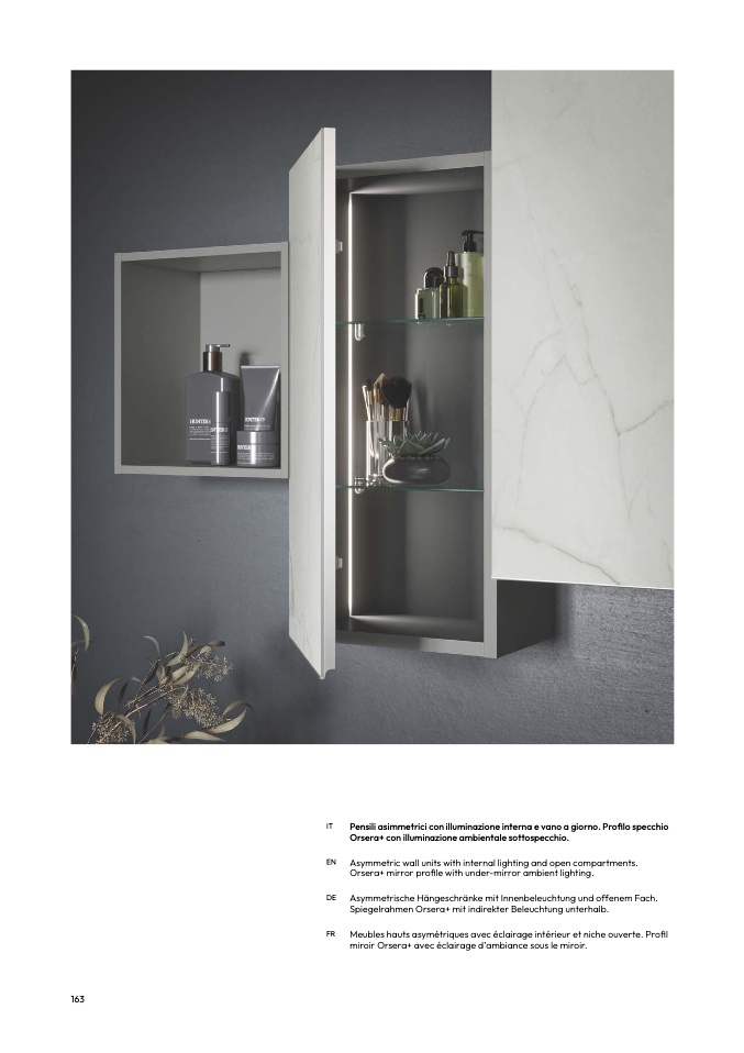 Pensili asimmetrici con illuminazione interna e vano a giorno. Profilo specchio