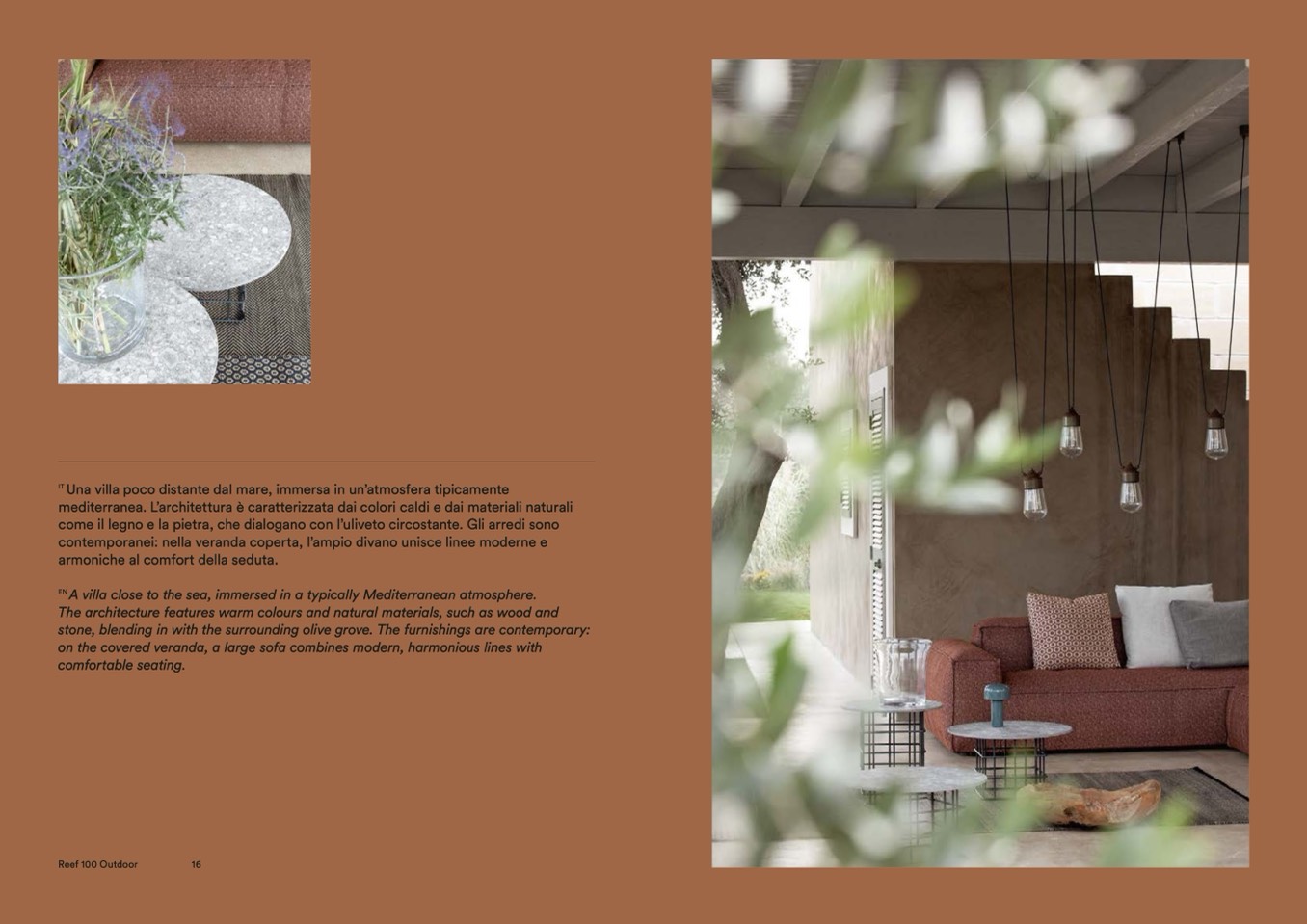 contemporanei: nella veranda coperta, l’ampio divano unisce linee moderne e