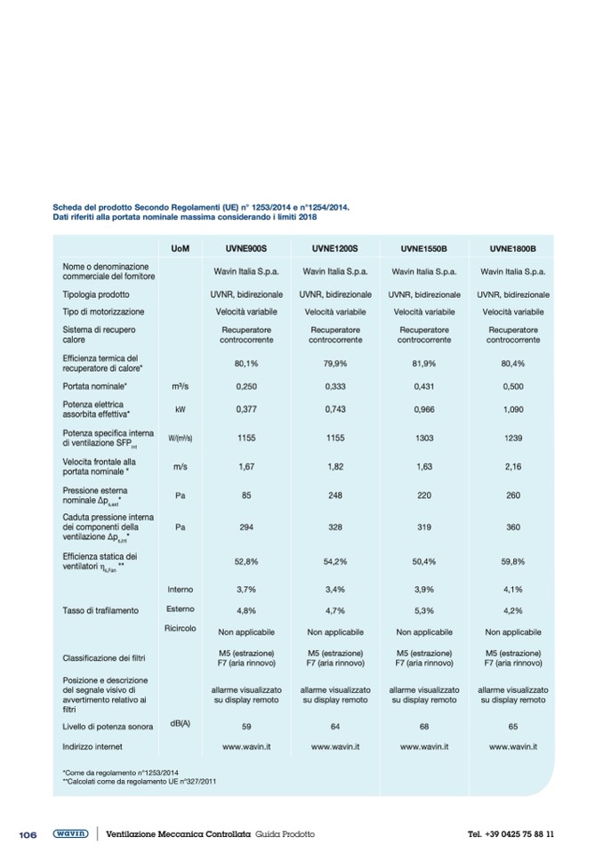 Scheda del prodotto Secondo Regolamenti (UE) n° 1253/2014 e n°1254/2014.