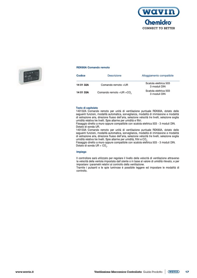 140133A Comando remoto per unità di ventilazione puntuale REK60A, dotato delle