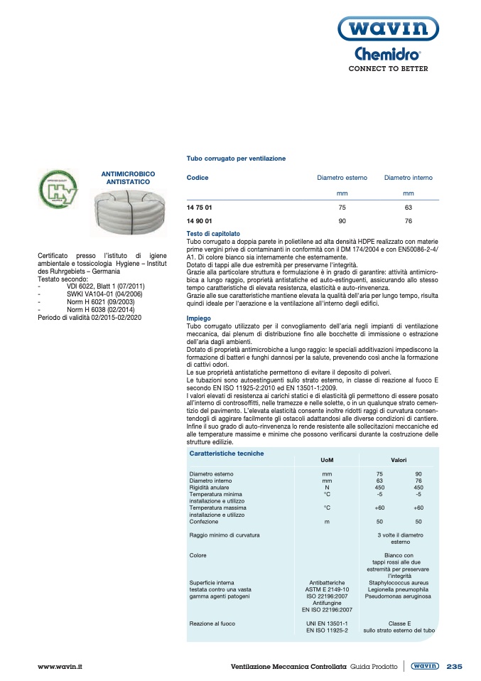 Le tubazioni sono autoestinguenti sullo strato esterno, in classe di reazione al fuoco E