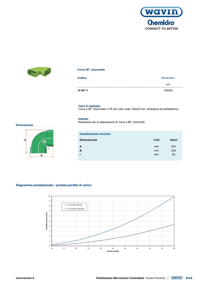 Curva a 90° orizzontale in PE per tubo ovale 102x50 mm, antistatica ed antibatterica.