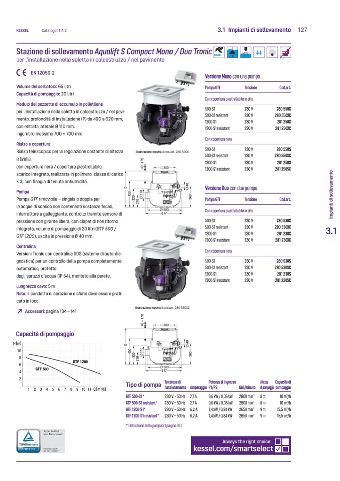 integrata, volume di pompaggio di 20 litri (GTF 500
