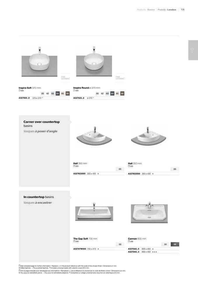 Voir la page indiquée pour développer les informations / Remplacer (..) de la référence du produit par le code de finition choisi / Dimensions en mm.