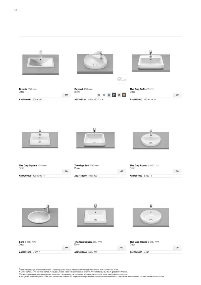 Voir la page indiquée pour développer les informations / Remplacer (..) de la référence du produit par le code de finition choisi / Dimensions en mm.