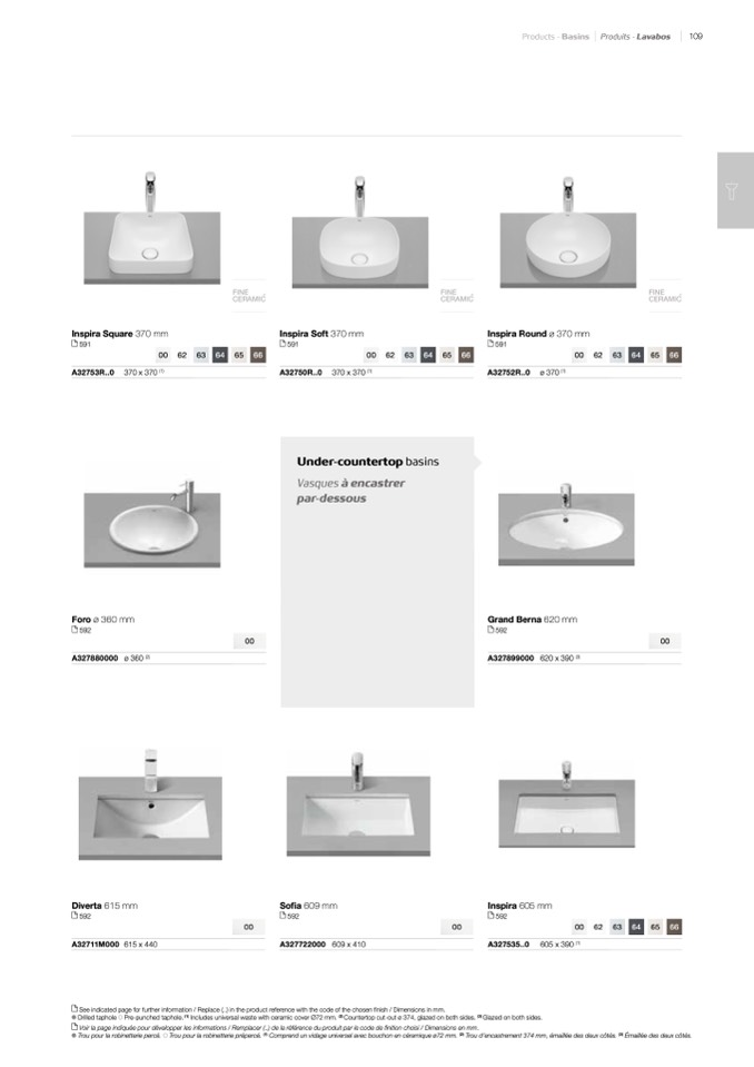 Voir la page indiquée pour développer les informations / Remplacer (..) de la référence du produit par le code de finition choisi / Dimensions en mm.
