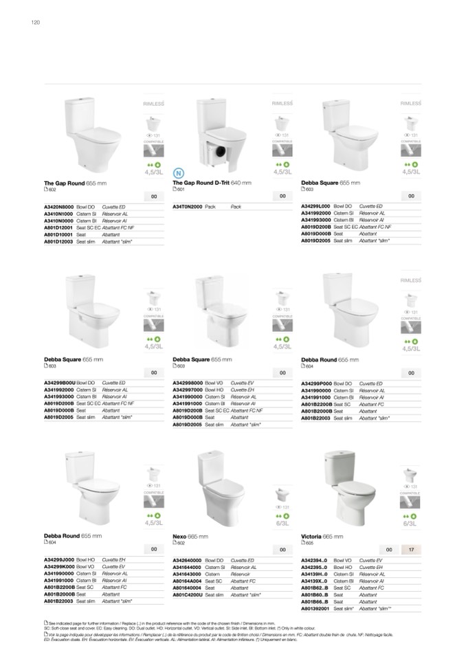 Voir la page indiquée pour développer les informations / Remplacer (..) de la référence du produit par le code de finition choisi / Dimensions en mm. FC: Abattant double frein de chute. NF: Nettoyage facile.