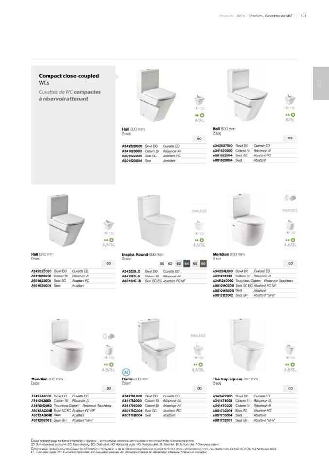 SC: Soft-close seat and cover. EC: Easy cleaning. DO: Dual outlet. HO: Horizontal outlet. VO: Vertical outlet. SI: Side inlet. BI: Bottom inlet.