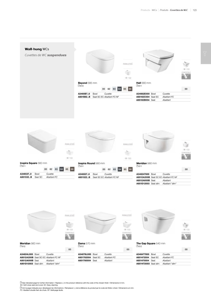 FC: Abattant double frein de chute. NF: Nettoyage facile.